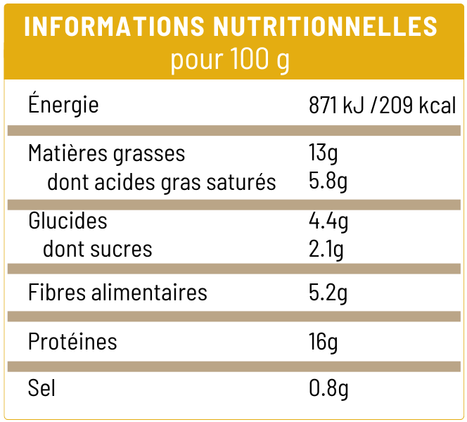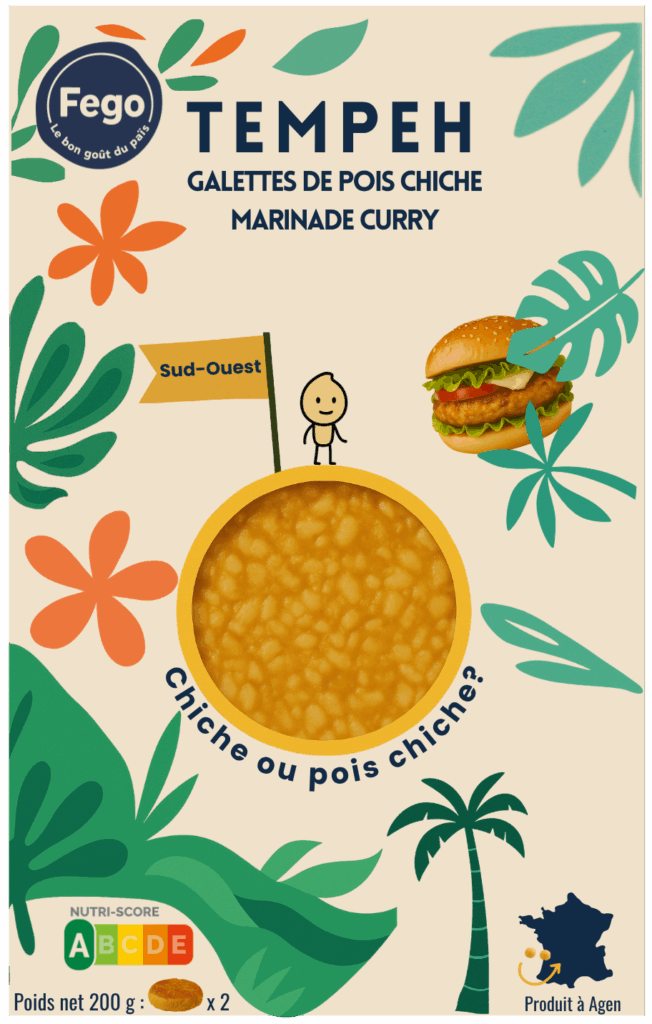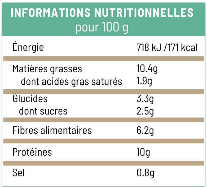 – Tempeh de pois chiche (70 %) : eau, pois chiche décortiqué***, acide lactique, ferment*.